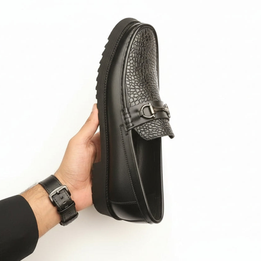 Step up your style game with these Black Croc-Embossed Leather Shoes – where luxury meets attitude. Crafted from high-quality leather with a bold crocodile texture, these shoes are designed for those who make an impression. Whether you're dressing up for a formal occasion or elevating your everyday fit, the sleek black finish and textured detailing offer timeless elegance with an edge.